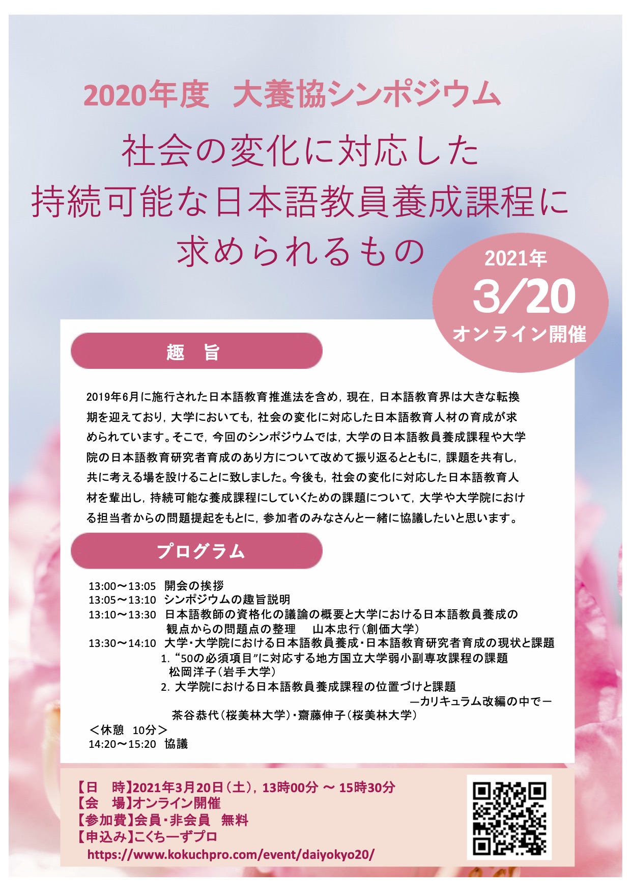 そこで,今回のシンポジウムでは,大学の日本語教員養成課程や大学院の日本語教育研究者育成のあり方について改めて振り返るとともに,課題を共有し,共に考える場を設けることに致しました。今後も,社会の変化に対応した日本語教育人材を輩出し,持続可能な養成課程にしていくための課題について,大学や大学院における担当者からの問題提起をもとに,参加者のみなさんと一緒に協議したいと思います。