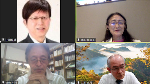 座談会:左上 中川良雄氏(京都外国語大学)、右上 岡本能里子氏(大養協副代表理事)、左下 木村哲也氏(大東文化大学)、右下 山本忠行氏(創価大学)