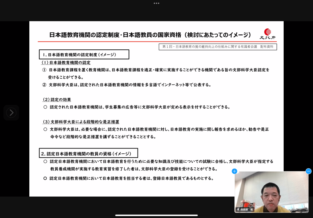 まず第Ⅰ部として、文化庁国語課長補佐の堀敏治氏より「日本語教育の質の維持向上の仕組みに関する有識者会議」の検討状況報告および令和5年度日本語教育事業(予算要求状況)についてご説明いただき、さらに、事前に会員から募集した質問にお答えいただきました。