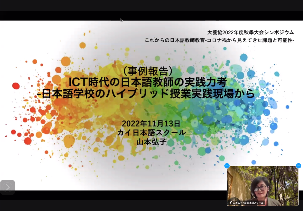 続いて第Ⅱ部として大養協理事より、コロナ禍を経て主にオンラインツールの活用が活発になった日本語教師教育環境に関連して、フィリピンのゼロ初級者向けPBL型日本語教育実習(西村美保氏)、アメリカの大学との交流授業(瀬尾匡輝氏)、日本語学校のハイブリッド授業(山本弘子氏)という三つの事例の紹介がありました。さらに尹智鉉氏を指定討論者として、学びの個別最適化を支えられる日本語教育の人材育成を目指したこれからの日本語教師教育について協議を行いました。