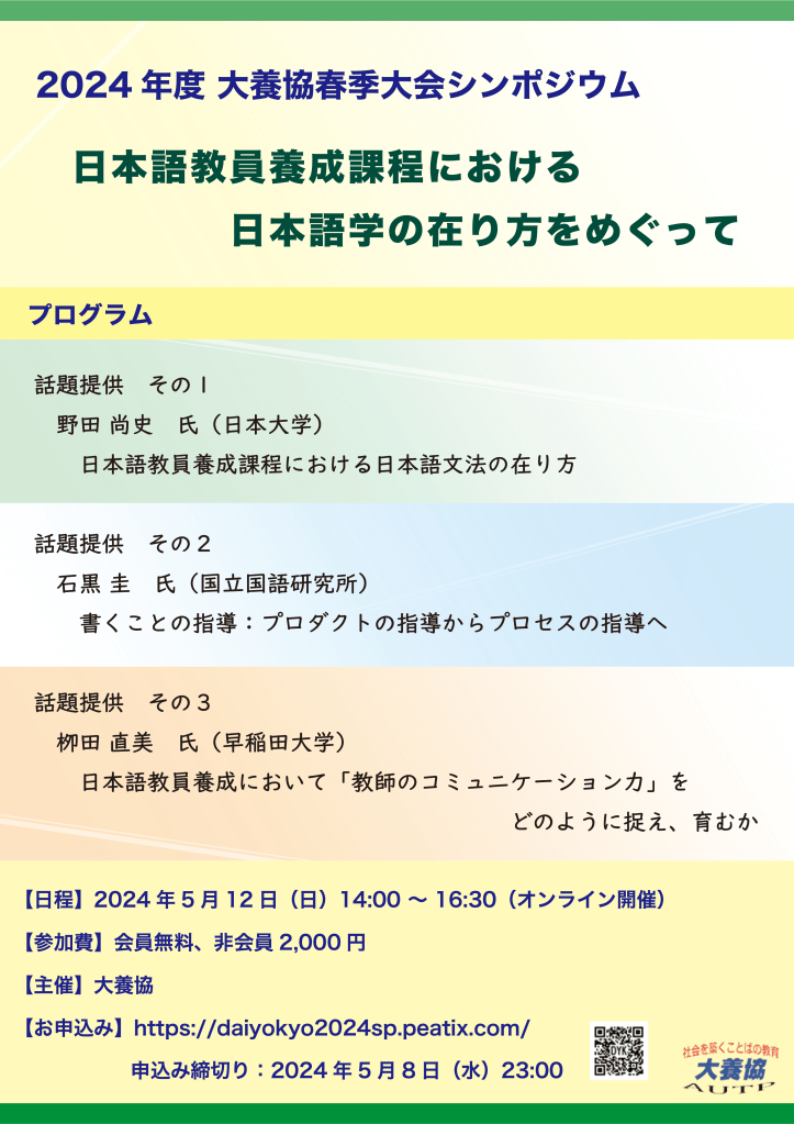 ※ 本シンポジウムに先立ち、オンラインにて 13 時より大学日本語教員養成課程研究協議会 2024 年度総会を開催いたします。会員のみなさまは、ご都合よろしければ、総会にもご出席くださいますようご案内申し上げます。