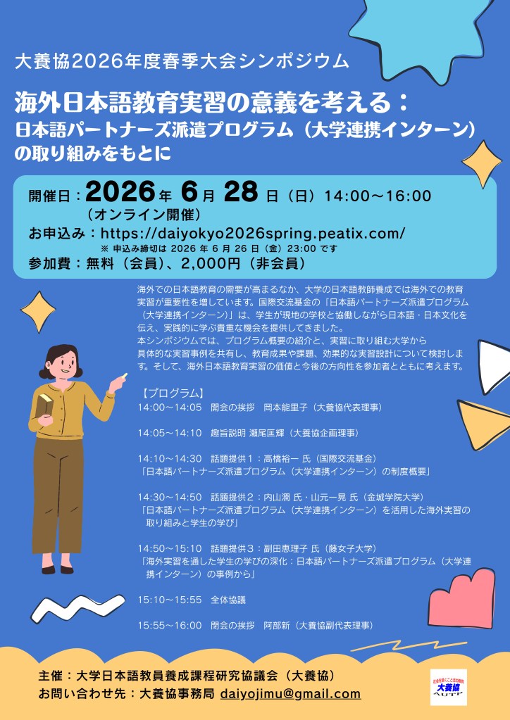 海外における日本語教育の需要が増大するなか、大学における実践的な日本語教師養成の一環として、現地校での教育実習の重要性が改めて問われています。国際交流基金が実施する「日本語パートナーズ派遣プログラム(大学連携インターン)」は、学生が海外の教育現場に身を置き、地域社会や学校と協働しながら日本語・日本文化を伝える貴重な機会を提供してきました。本プログラムを活用した実習は、言語教育能力の向上にとどまらず、異文化理解、国際的なコミュニケーション能力、教育への向き合い方の変容といった幅広い成長を学生にもたらしています。 本シンポジウムでは、まず国際交流基金より本プログラムの制度概要について紹介いただきます。そのうえで、実際に海外での日本語教育実習に取り組む大学から具体的な実践報告を行い、教育的成果、運営体制、課題、さらには効果的な実習設計のポイントについて、多角的に検討します。また、多くの大学に共通する「海外実習機会の確保・継続・発展」という課題に対し、大学現場での実践や取り組みを共有しながら、今後の可能性や連携の方向性を議論します。本シンポジウムを通じて、大学における海外日本語教育実習の価値と将来像を、参加者の皆さまとともに再考し、より実りある教育実践の構築を目指します。